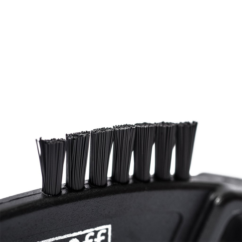 Διαθέτει ειδικά πλαστικά δόντια για την απομάκρυνση της λάσπης και τρεις κεφαλές διαφορετικού μεγέθους και σκληρότητας, με νάιλον τρίχες, για τον καθαρισμό δυσπρόσιτων εξαρτημάτων περιφερειακά της αλυσίδας όπως τα κέντρα του γραναζιού και της ζάντας αλλά και τους οδηγούς περιστροφής και ρύθμισης της αλυσίδας.