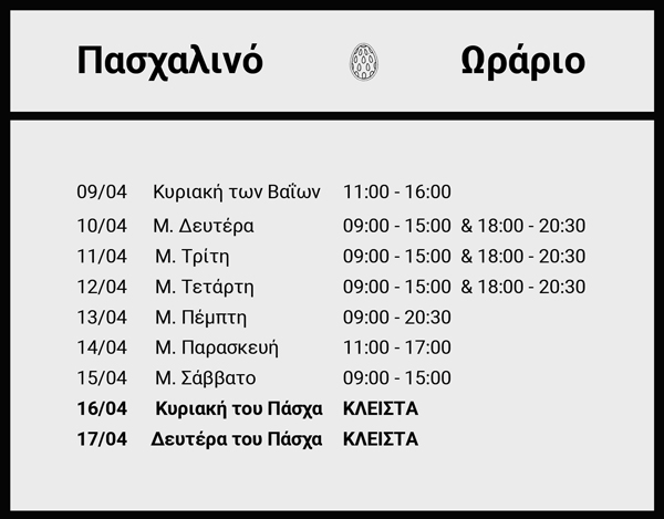 Από την Κυριακή των Βαΐων μπορείς να επισκέπτεσαι το GAS για τα Πασχαλινά σου δώρα τις παρακάτω ώρες 👇