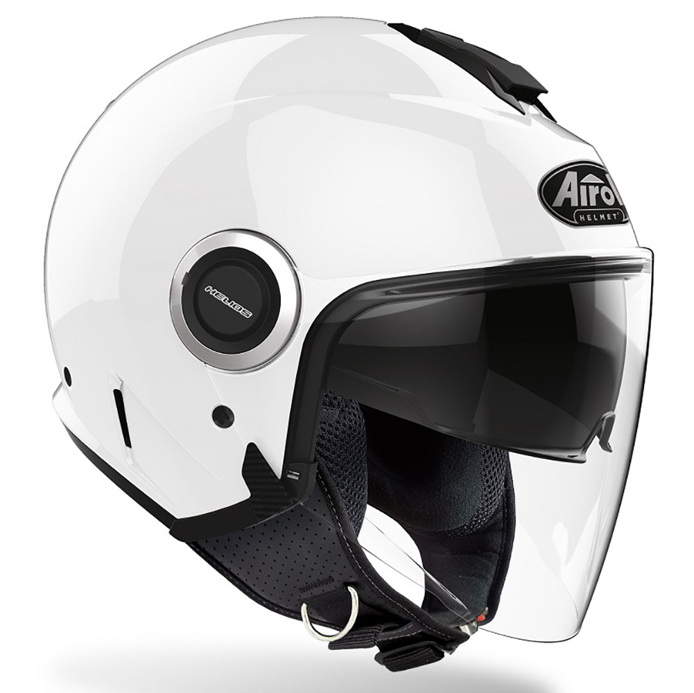 Κράνος ανοιχτού τύπου Airoh Helios σε λευκό γυαλιστερό χρώμα. Το Helios της Airoh είναι ένα jet κράνος πόλης, μοντέρνας σχεδίασης με σύγχρονα υλικά και πολύ καλή ποιότητα κατασκευής για την τιμή του. Θερμοπλαστικό εξωτερικό κέλυφος σε 3 διαφορετικά μεγέθη, εσωτερική φιμέ ζελατίνα, καλός εξαερισμός από τους 4 συνολικά αεραγωγούς του, υπο-αλλεργικές αφαιρούμενες εσωτερικές επενδύσεις που πλένονται και κλείσιμο με πλαστική μικρομετρική πόρπη. Στην όμορφη εμφάνιση του Airoh Helios προσθέτει και το κιτ/τάπες που σου επιτρέπουν να βγάλεις την εξωτερική διάφανη ζελατίνα, για ένα ακόμα πιο κλασικό - μοντέρνο look.