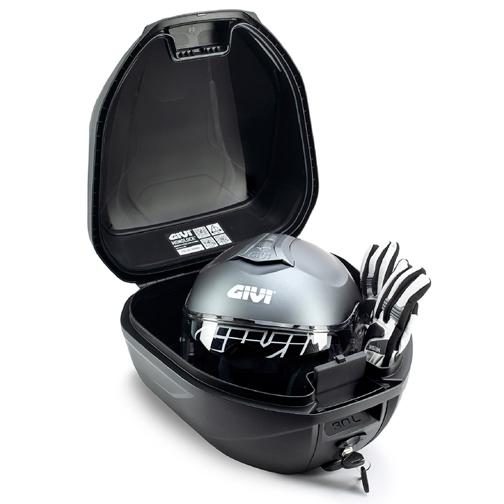 Επιτρέπει την αποθήκευση ενός modular κράνους. Κατασκευασμένη από πλαστικό, με υλικά και μηχανισμούς υψηλής ποιότητας από την κορυφαία ιταλική Givi και πλήρη κάλυψη σε οποιοδήποτε ανταλλακτικό.