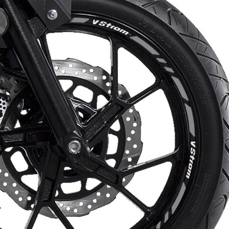 Διακοσμητικά αυτοκόλλητα για ζάντες μοτό, ταινία τροχών από την MD σε ασημί χρώμα με το λογότυπο του Suzuki V-Strom σε άσπρο.