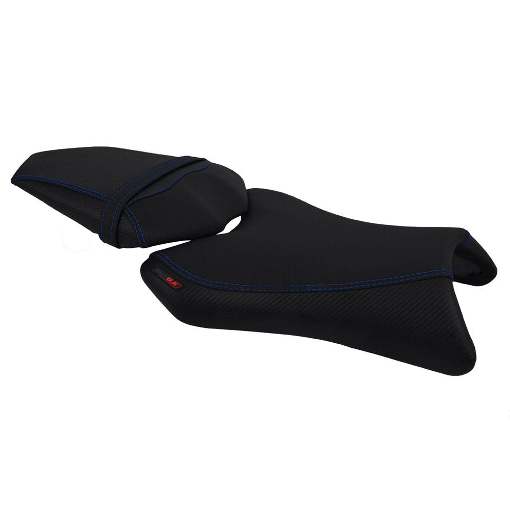 Moto.K D386 κάλυμμα σέλας άριστης ποιότητας για Yamaha FZ1 Fazer 1000 Naked (μοντ. 2006-2016), με συνδυασμό υλικών άριστης ποιότητας σε μαύρο και carbon χρώμα και ραφές σε μπλε χρώμα.