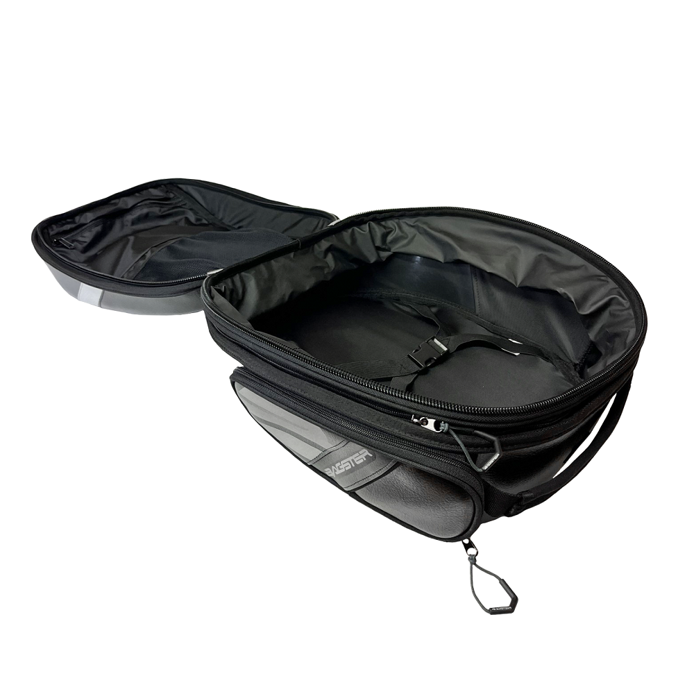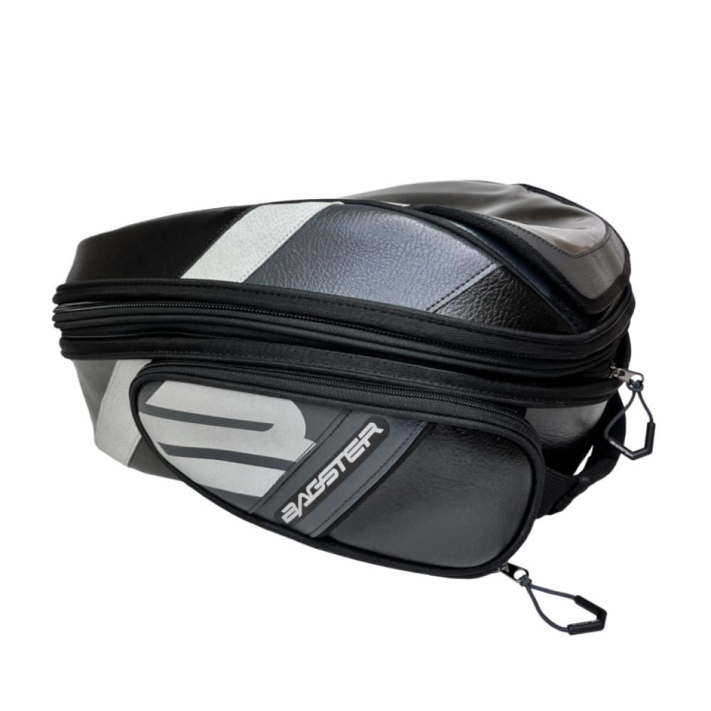 Tank bag - σακίδιο ρεζερβουάρ Bagster Stunt Evo σε μαύρο και άσπρο χρώμα για το ντεπόζιτο μηχανής. Η τσάντα Bagster είναι χωρητικότητας 30 λίτρων με δυνατότητα μεταφοράς κράνους full face και εφαρμόζει με ειδικά κουμπώματα σε κάλυμμα ρεζερβουάρ Bagster.