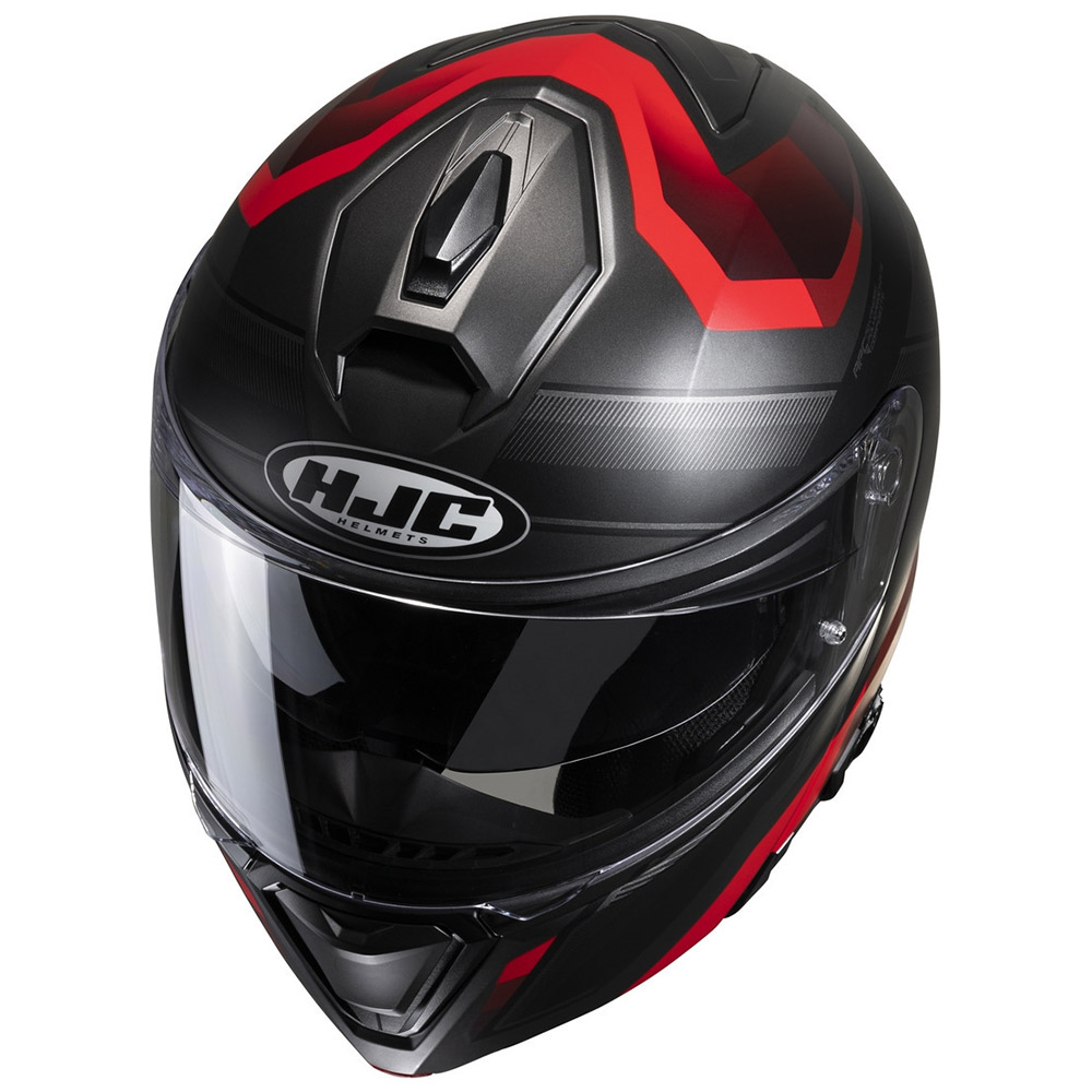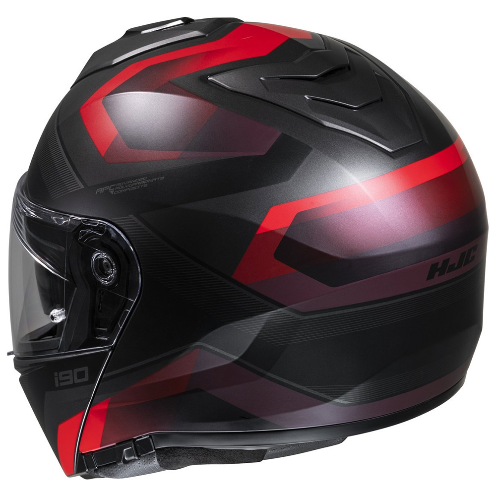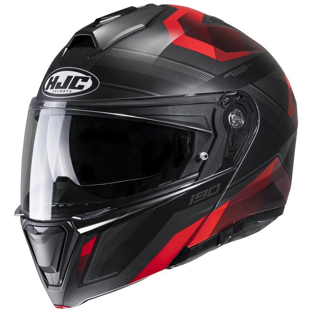 Modular Κράνη HJC. Hjc i-90 Lark MC1SF Aνοιγόμενα κράνη σε μαύρο χρώμα με κόκκινα γραφικά. Το νέο για το 2020 flip-up κράνος της HJC ανήκει στην μεσαία κατηγορία τιμής και προορίζεται για γενική αστική και τουριστική χρήση, με κατασκευή εξωτερικού κελύφους από Advanced Polycarbonate θερμοπλαστικό υλικό, αφαιρούμενες εσωτερικές επενδύσεις που πλένονται και εξαερισμό με πολλαπλούς αεραγωγούς εισαγωγής και εξαγωγής.