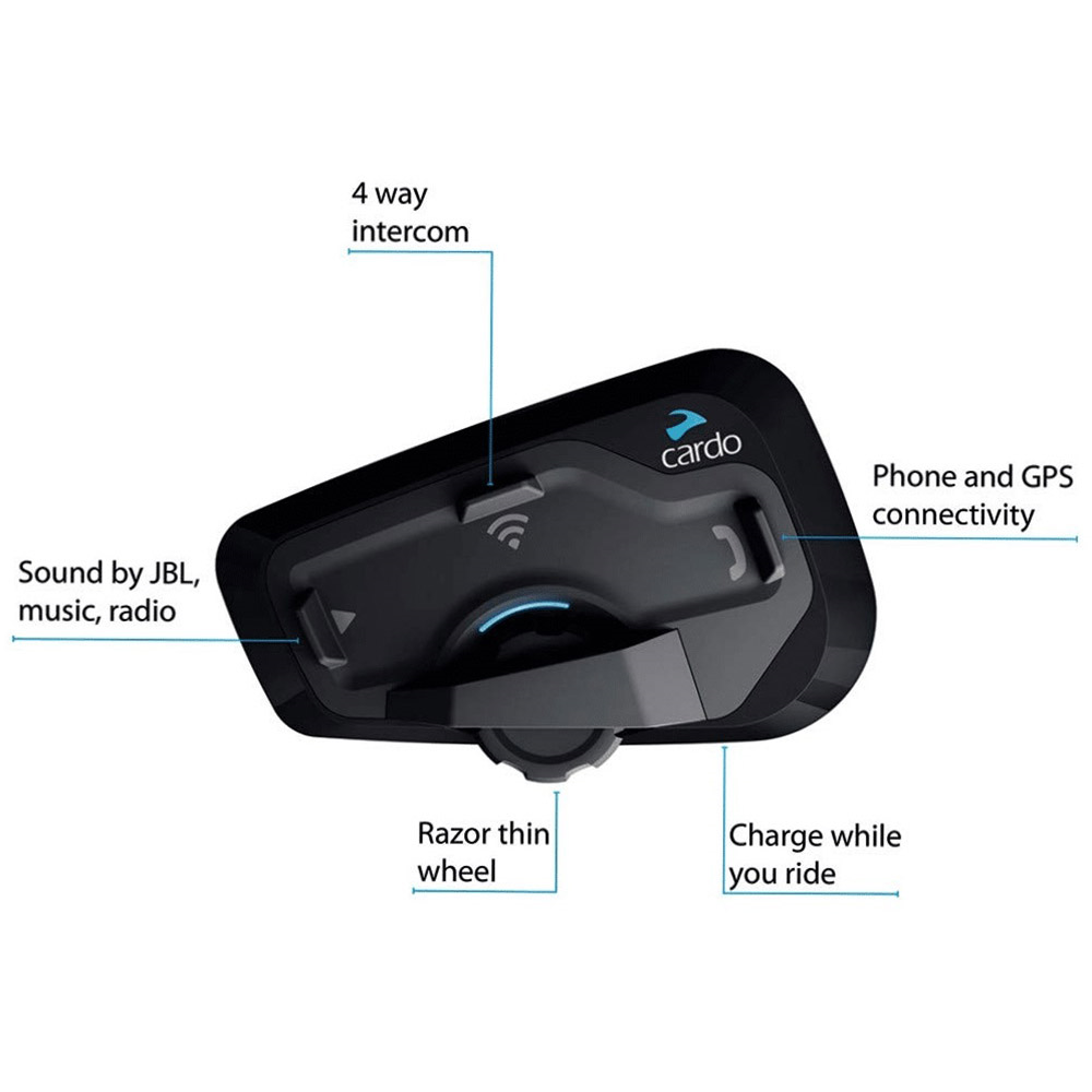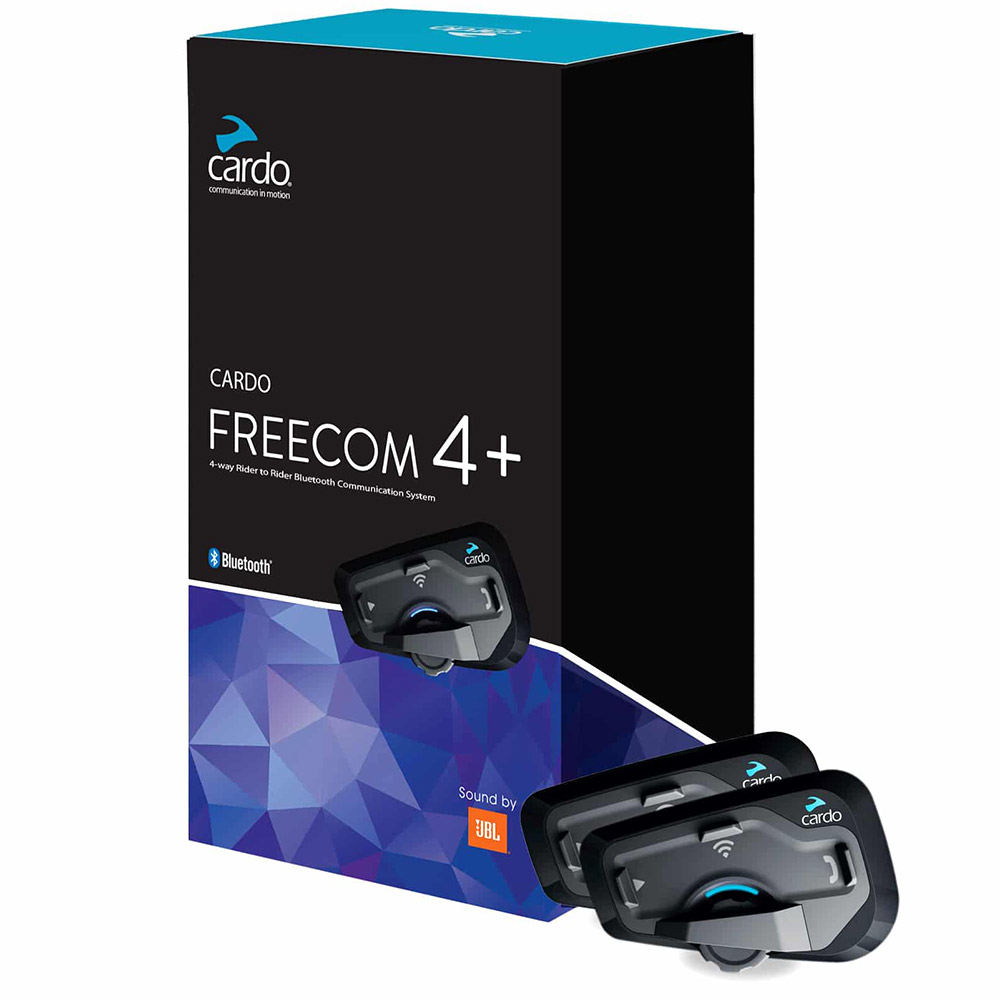 Cardo Freecom 4+ σύστημα ενδοεπικοινωνίας κράνους. Duo σετ 2 τεμαχίων. Απρόσκοπτη επικοινωνία με τρεις ακόμη αναβάτες με το πάτημα ενός κουμπιού, με συνδεσιμότητα Bluetooth 4.1 και εξαιρετική αποτελεσματικότητα στις παρεμβολές και τον θόρυβο, σας επιτρέπει να μιλήσετε με συνεπιβάτες και συνοδοιπόρους έως 1,2 χιλιόμετρα απόσταση, να πραγματοποιήσετε κλήσεις, να ακούσετε μουσική και άλλα, απλά με ένα άγγιγμα του δακτύλου ή τον ήχο της φωνής σας.