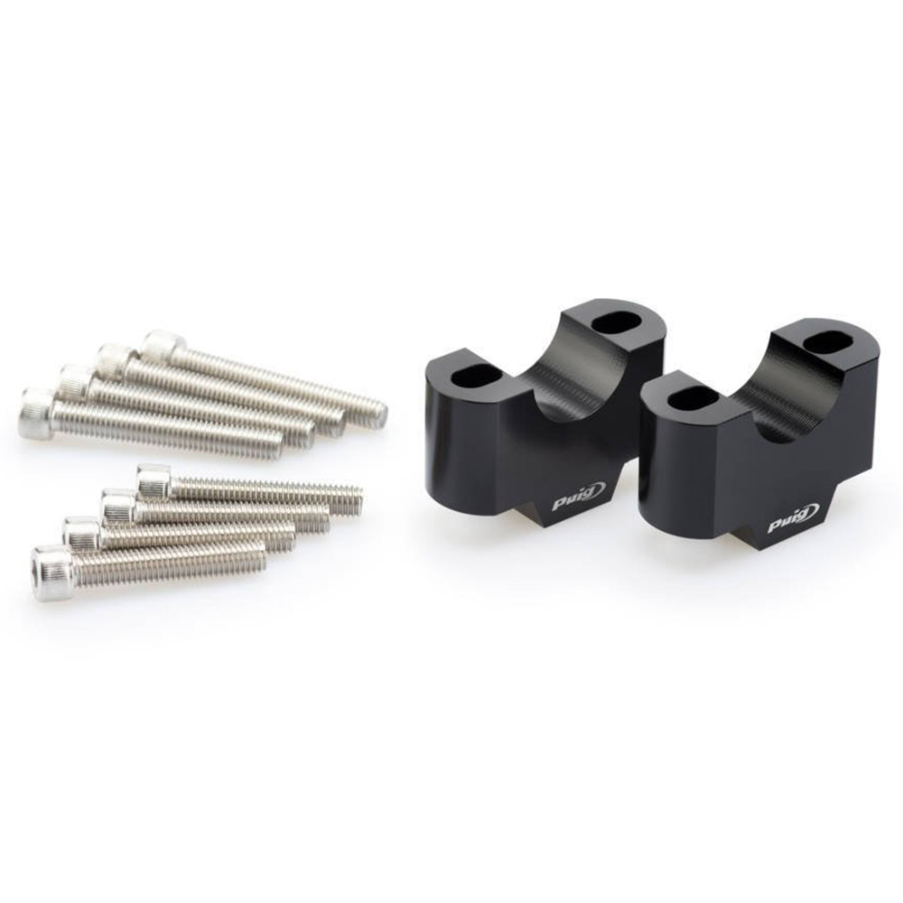 Puig 3741N 30mm αποστάτες τιμονιού με διάμετρο 28.6mm σε μαύρο χρώμα και κατεργασία από ανοδιωμένο αλουμίνιο. Το τιμόνι "σηκώνεται" 30mm με την ίδια κλίση που είχε και πριν. Στην νέα, λοιπόν, θέση οδήγησης τα χέρια είναι πιο ξεκούραστα βελτιώνοντας την άνεση και ο έλεγχος της μοτοσυκλέτας ακριβής. Στην συσκευασία περιλαμβάνεται όλες οι απαραίτητες βίδες.