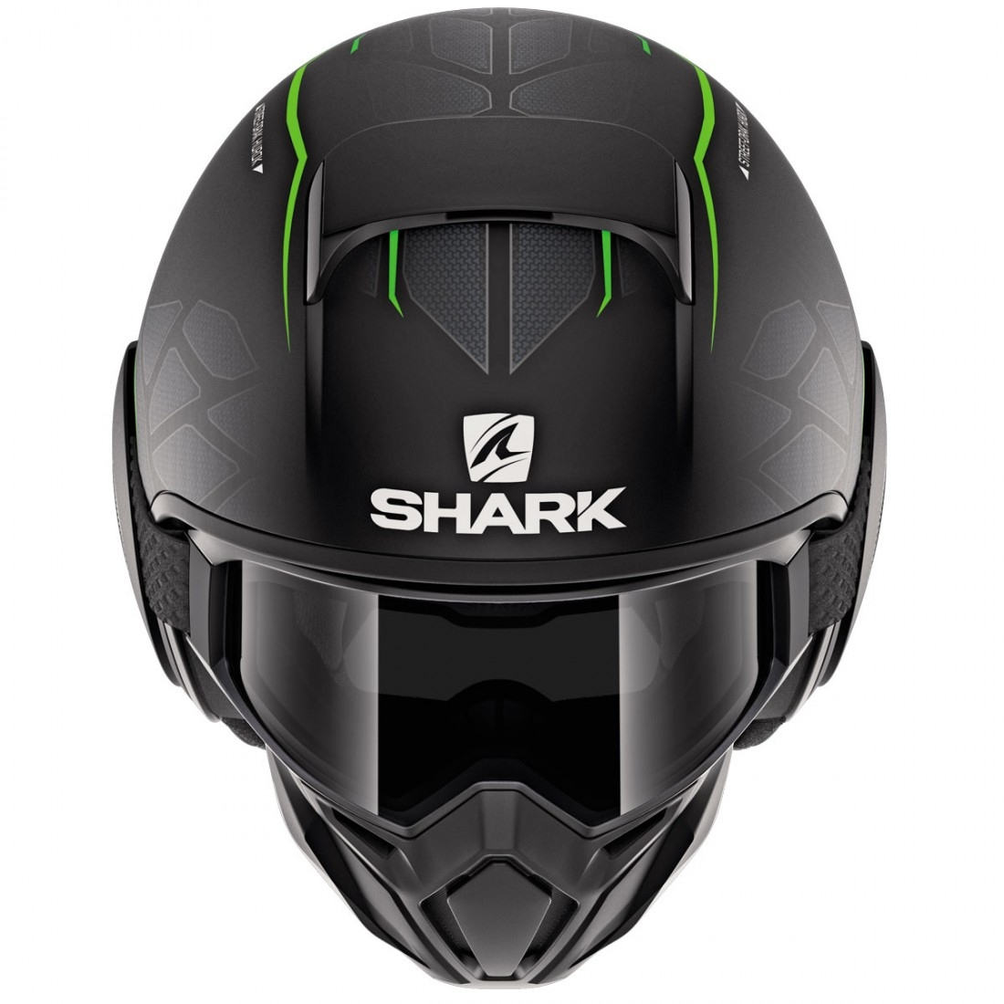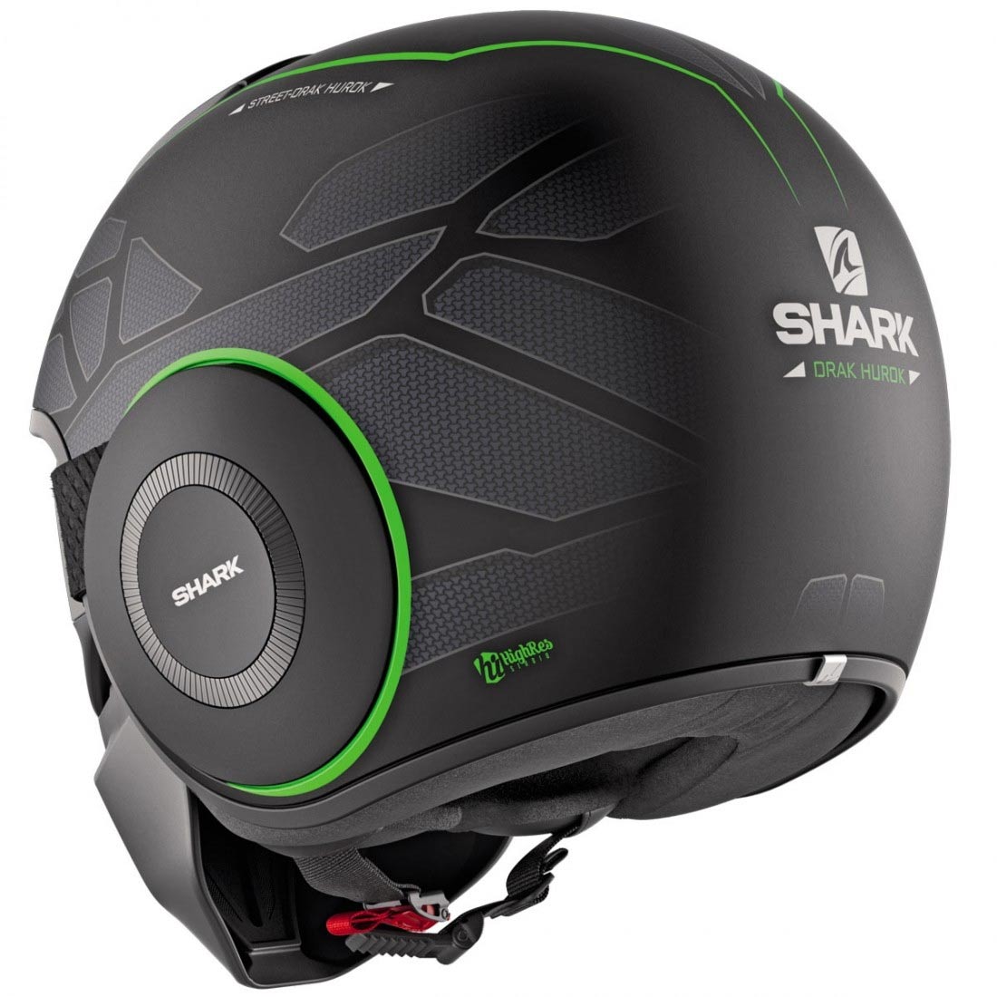 Jet κράνος ανοιχτού τύπου Shark Street Drak στην Hurok Black/Green χρωματική έκδοση. Με σχεδιασμό εμπνευσμένο από χαρακτήρες video games, το Street Drak της Shark μοιάζει πολύ με στρατιωτικού τύπου "tactical" κράνος, με ιδιαίτερα μαζεμένες εξωτερικές διαστάσεις.