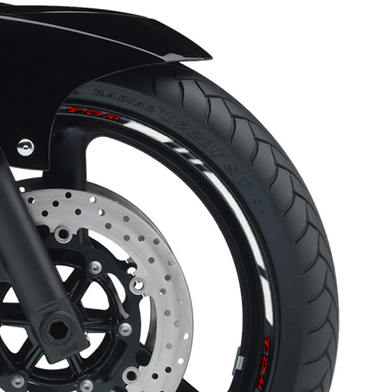 Rim stickers for moto wheels from MD in white reflect color with Yamaha TDM logo in red color. Complete set of 18 pre-curved strips 9 mm wide for the front and rear wheel, the MD rim stickers are made of high quality 3M & Oracal vinyl. This set includes 4 strips for each side of the wheel plus 1 spare strip per wheel, 16 stickers plus 2 spares with the TDM logo and installation instructions.