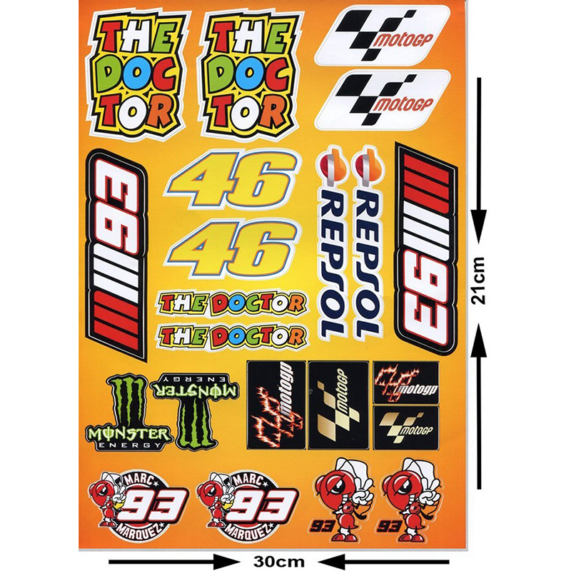 set of 21 MotoGP theme stickers by MD. Made from premium high quality 3M vinyl sticker, it comes as a 30 x 21 cm card with various sticker colors and sizes.