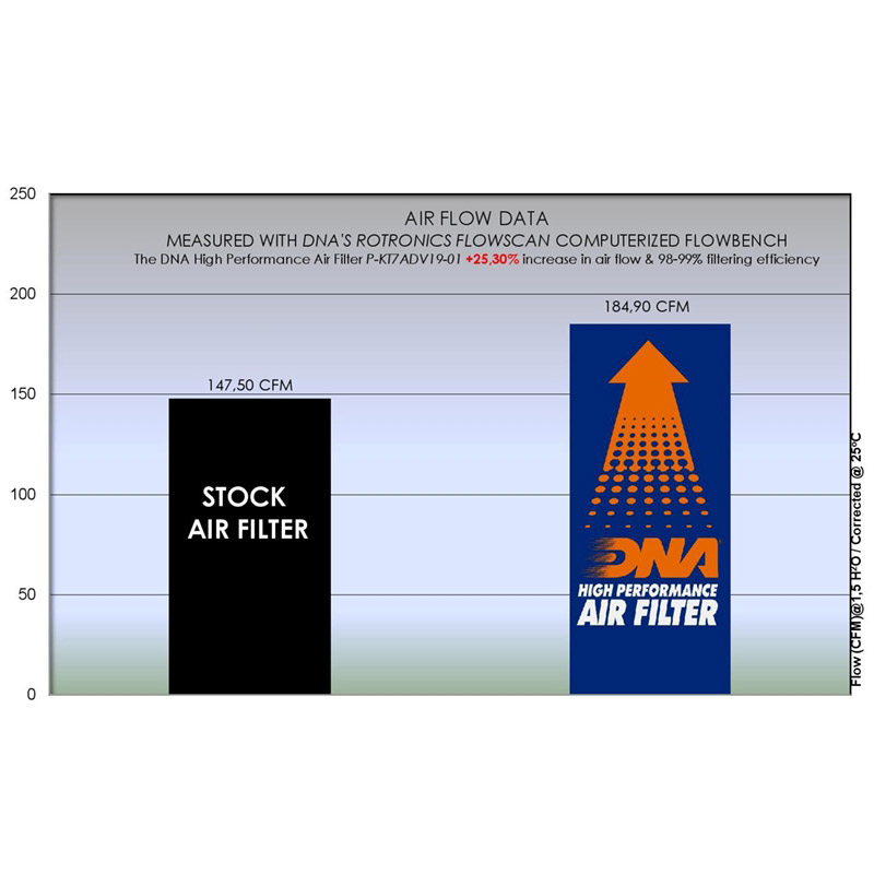 Air filter DNA features DNA's advanced FCd (Full Contour design), perfect airtight sealing and trouble free filter installation for the user is guaranteed by using a high quality EVA seal. The filtering efficiency is extremely high at 98-99% with 4 layers of DNA Cotton and the flow of this DNA Fcd filter is high, 25.30% more than the stock paper filter!