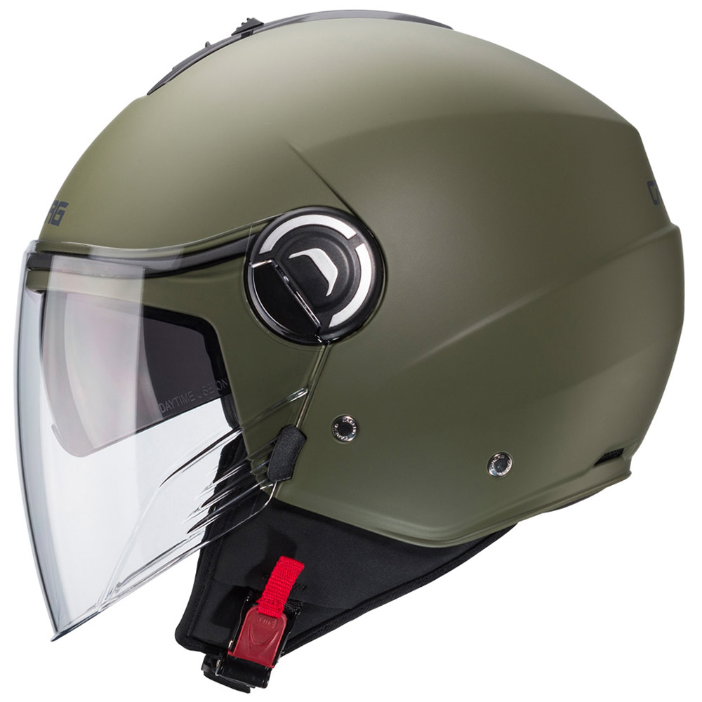 Caberg Riviera V4 29 matt military green jet helmet. Caberg Riviera V4 is the latest iteration of the popular urban jet Caberg helmet, a long time best seller for it's built quality and fine fit.
