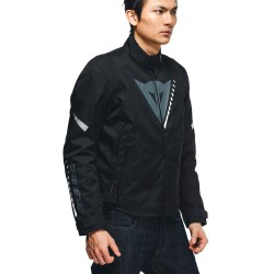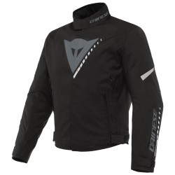 Dainese Veloce D-Dry men's three-season motorcycle jacket here in black color with charcoal gray and white details, with fixed D-Dry® waterproof membrane, a removable thermal lining, and composite protectors on the shoulders and elbows. The Veloce D-Dry® motorcycle jacket is perfect in all conditions, from spring temperatures, to changeable autumn weather and even the cold of winter.