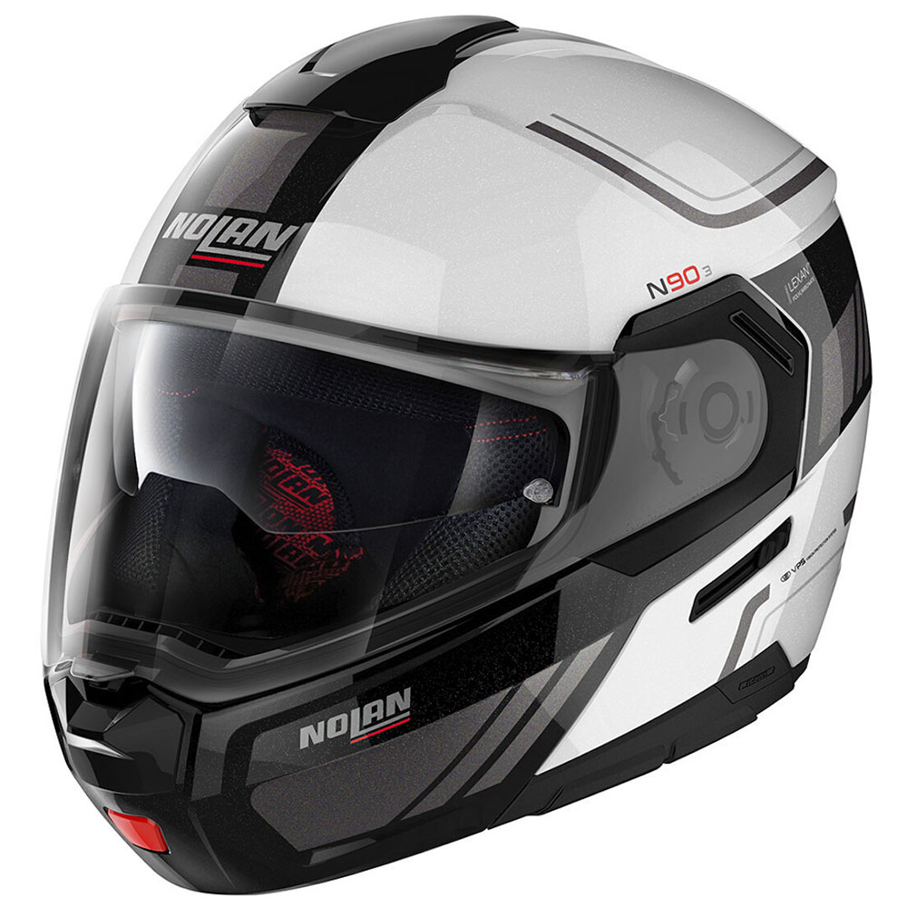 Flip-Up helmet Nolan N90-3 in Voyager N-Com 17 Metal white color. Helmet NOLAN N90-3 is an update of the N90-2 model, the full-face, flip-up helmet suitable for touring and urban riding alike, highly appreciated for its solid and compact design and its high standard of quality common to all Nolan products.