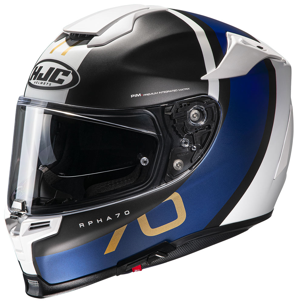 HJC RPHA 70 Paika MC-2SF Full Face Motorcycle Helmet. A supreme sport-touring helmet designed for any ride from quick commutes to cross-country cruises. The RPHA 70 is exceptionally compact and lightweight as a result of the Premium Integrated Matrix (P.I.M. Plus) shell that provides enhanced shock-resistance with reinforcement materials that include carbon and carbon-glass hybrid fabric.