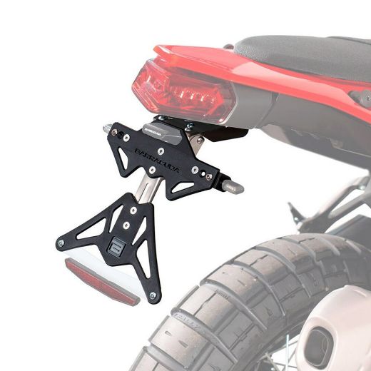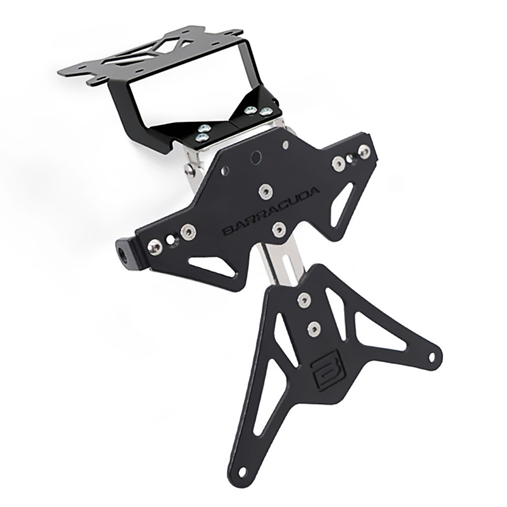 The licence plate base Barracuda is precision made using the latest in laser cutting technology, manufactured in aluminium, finished with black anodized coating and iron junction for the regulation. It is specific for the model and the kit is complete of assembling bracket and screws. The assembling need no modification to the original parts.