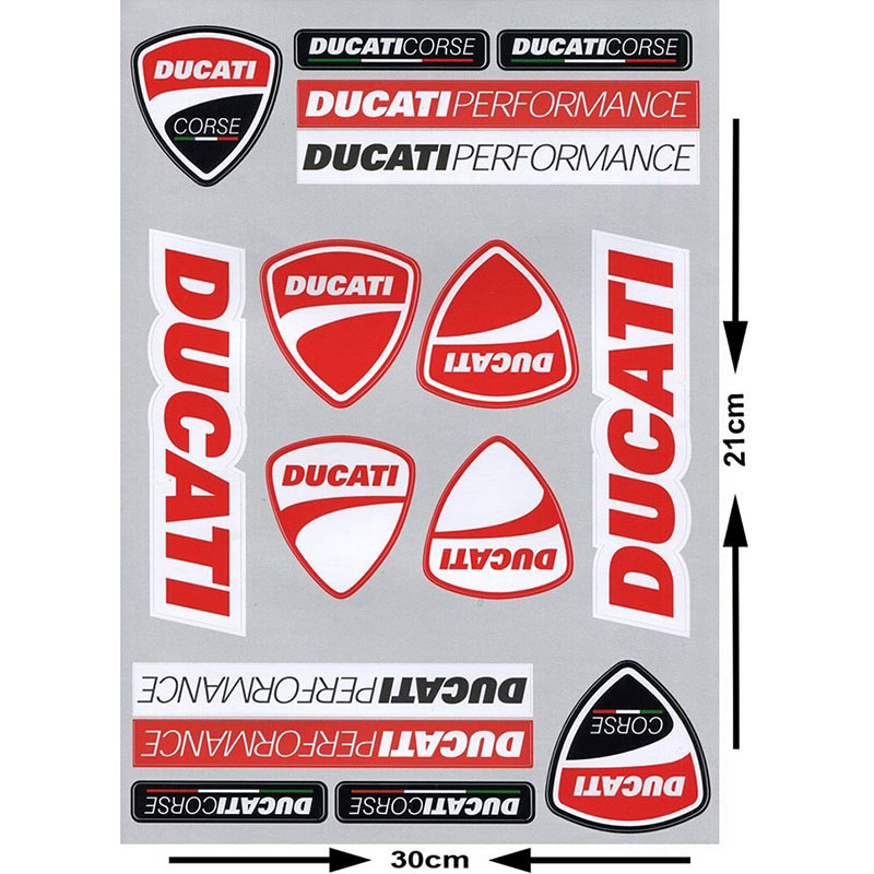 Set of 16 Ducati stickers by MD. Made from premium high quality 3M vinyl sticker, it comes as a 30 x 21 cm card with various sticker colors and sizes.