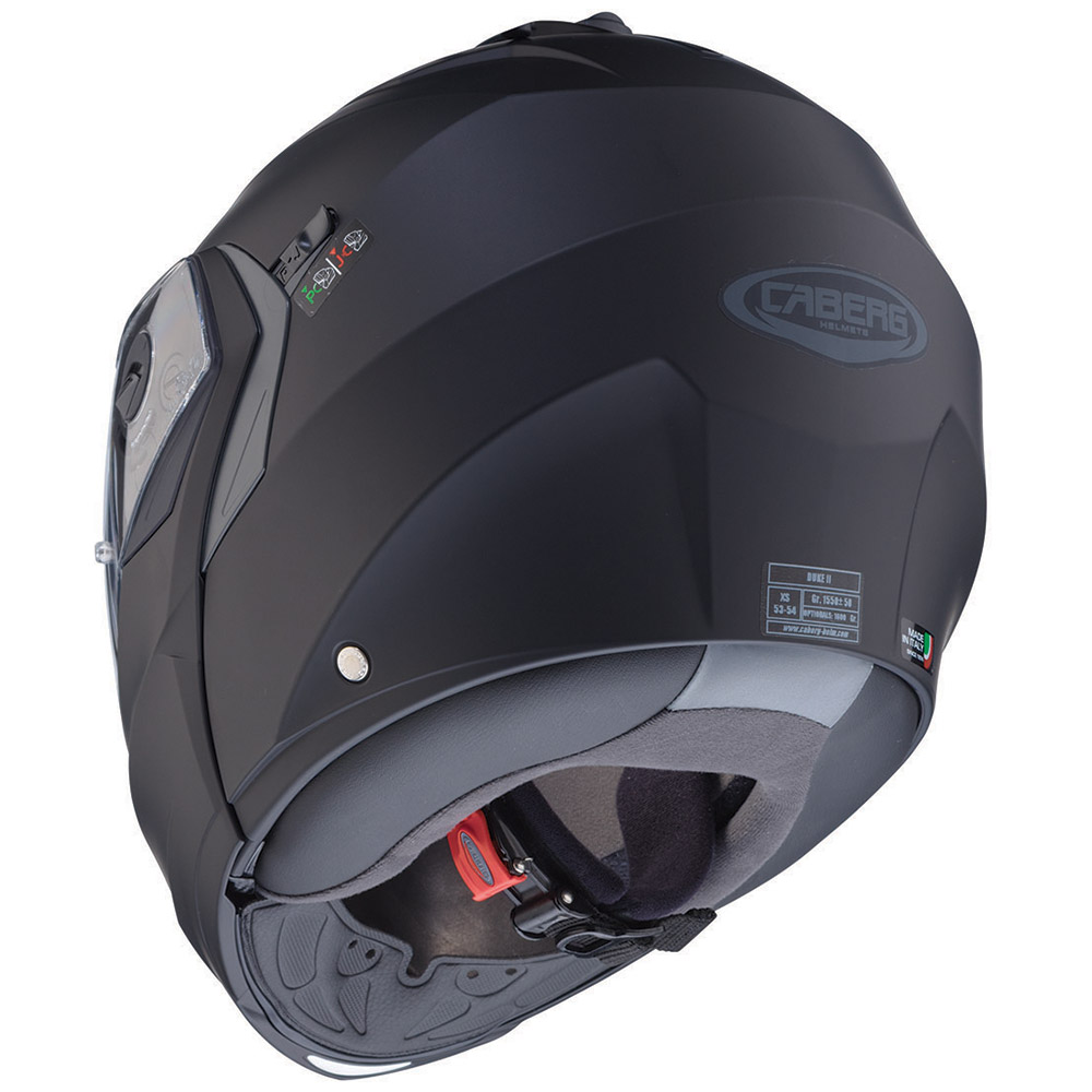 Motorcycle Modular Helmets CABERG. Caberg Duke X Flip-Up helmet in 17 Matt Black color the Caberg helmet 100% Made in Italy with a captivating look and innovative technical solutions. The DUKE X is the new version of the popular Duke/Duke II with a new chin guard opening system able to pass all the tests required by ECE 22.06 P/J.