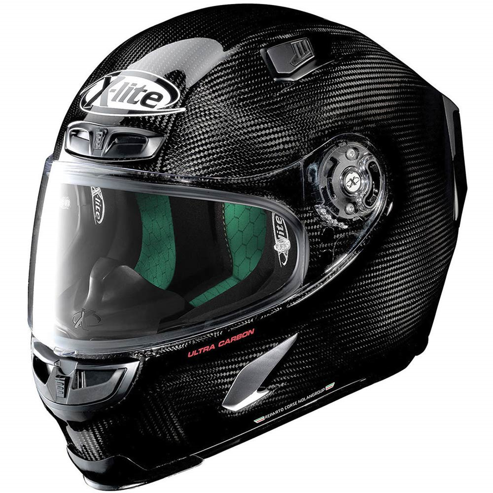 Racing Full-Face Motorcycle Helmets X-LITE. This X-Lite exclusive high-carbon content version of their new full-face racing helmet, the helmet X-Lite X-803 Ulta Carbon Puro 1 Carbon has reduced weight and compact size thanks to the carbon-rich construction and the availability of three outer shell sizes.