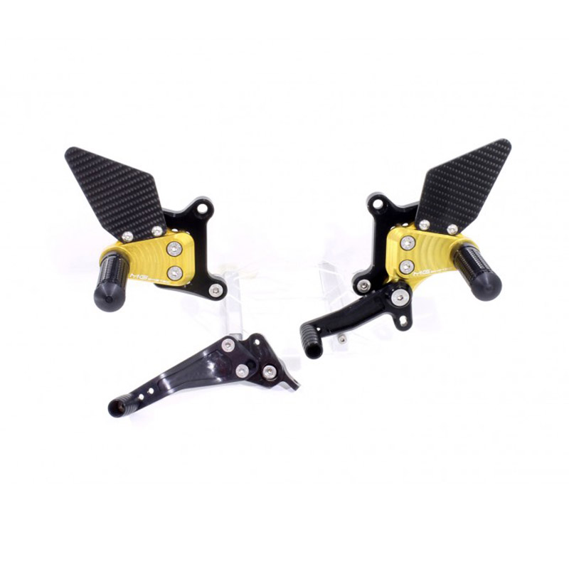 Rearset MG BIKETEC YAMAHA FZ1. Race tested rear set MG Biketec 2510-996010 for Yamaha FZ1 Fazer (2006-2015) and FZ8 Fazer (2010-2015) motorcycles, fully ergonomically adjustable in 9 positions and up to 20 mm, in black and gold color.