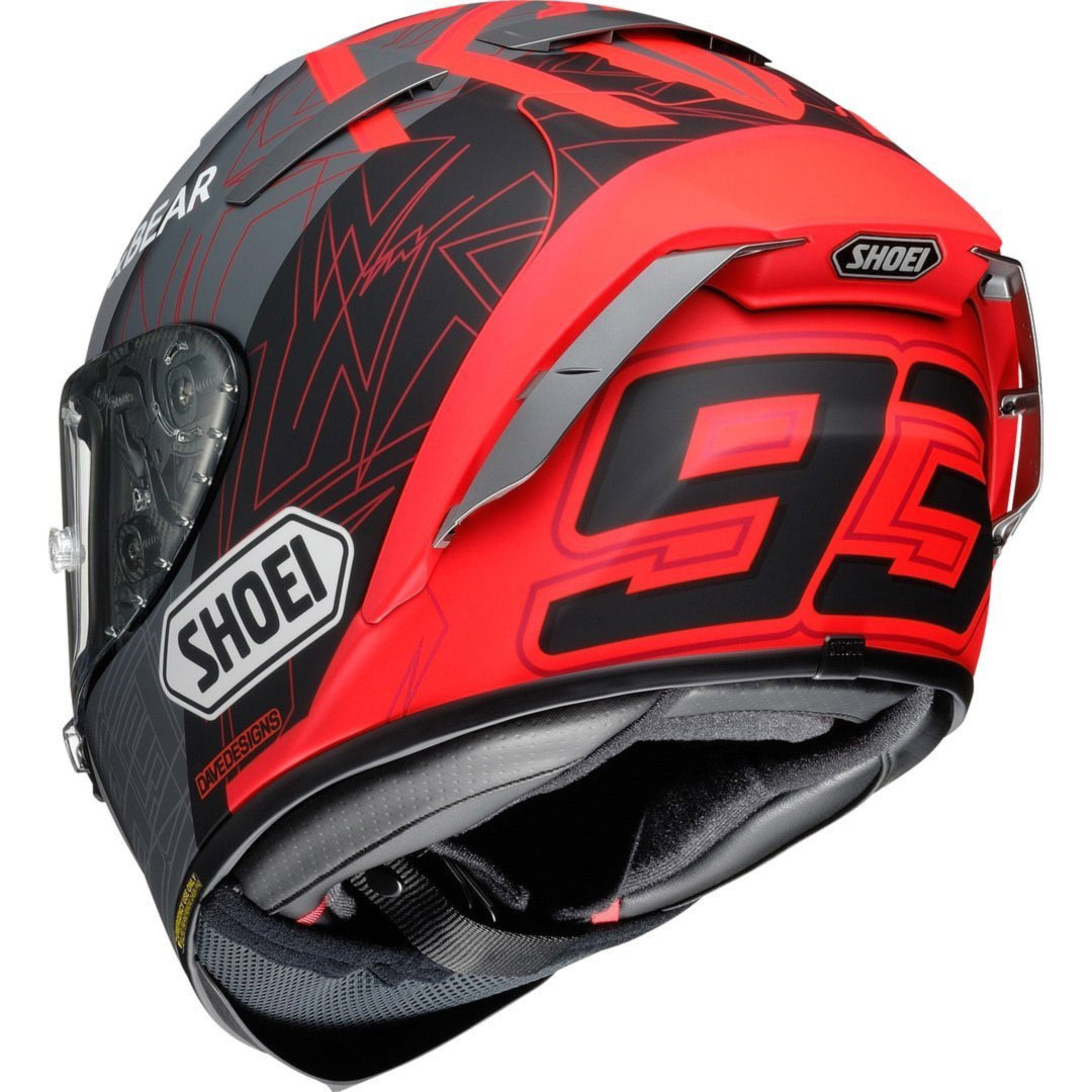 Shoei X-Spirit III Replica Marc Marquez, the pure racing helmet. When going flat out on a MotoGP bike, you do not have any time to take care about issues with your helmet. This was one of the main targets during the development of the X-Spirit III. The helmet should be perfect for racing, and nothing else. With the extreme ventilation performance and the highly sophisticated aerodynamic system, the X-Spirit III is your perfect companion to take the top place on the podium.