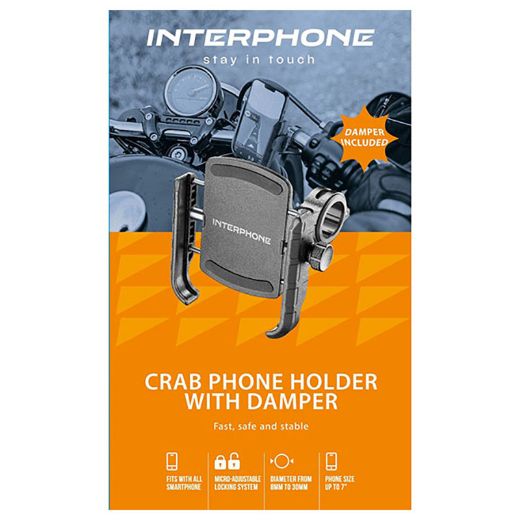 Smartphone holders Interphone. Universal phone base Interphone Crab smartphone holder. Get on the bike and always carry your smartphone with you. Aluminum PA66 support, universal and ultra resistant, the quick coupling and release allows you to handle the mobile phone even if protected by the cover and to use the touchscreen in comfort.